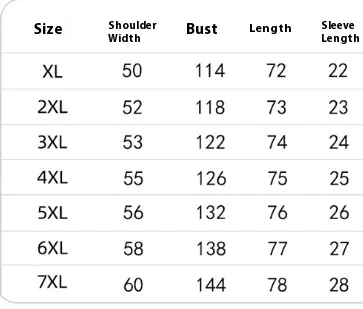المقاس: XL، 2XL، 3XL، 4XL، 5XL، 6XL، 7XL